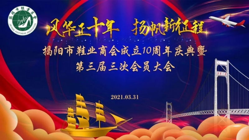 2021年3月31日,揭阳市榕江大酒店锦绣店花灯璀璨,高朋满座,歌舞盛宴,笑语满堂。风华正十年.扬帆新征程,揭阳市鞋业商会十周年庆典活动暨第三届第三次会员大会在此隆重举行。商会会员欢聚一堂,沟通友情,畅叙友谊,共谋揭阳鞋业发展大计,共创商会明天更加辉煌。