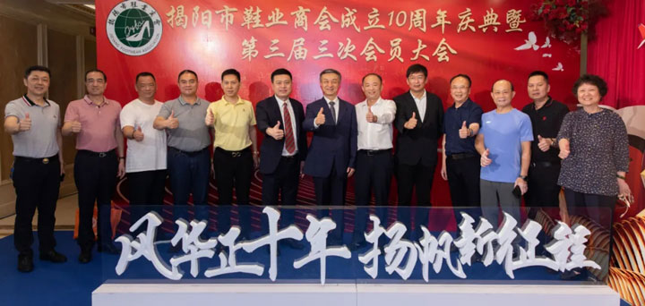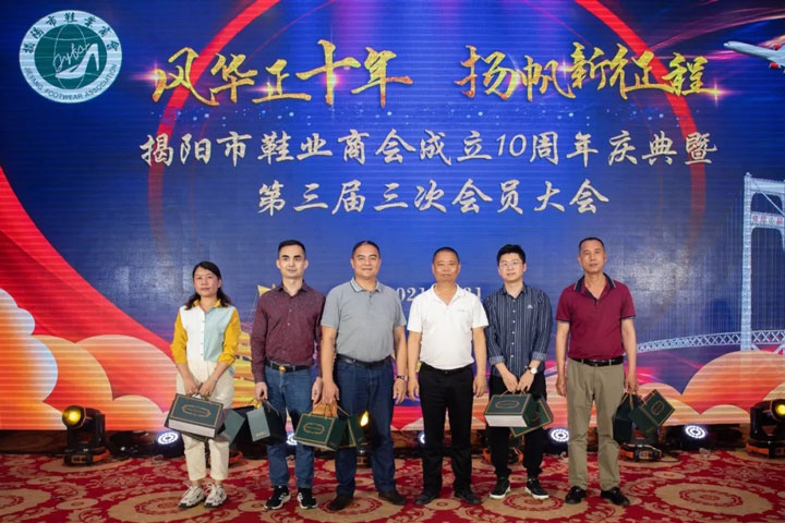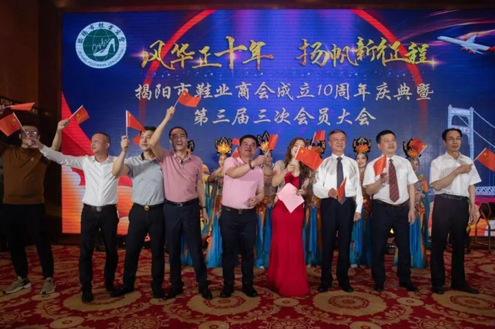 2021年3月31日,揭阳市榕江大酒店锦绣店花灯璀璨,高朋满座,歌舞盛宴,笑语满堂。风华正十年.扬帆新征程,揭阳市鞋业商会十周年庆典活动暨第三届第三次会员大会在此隆重举行。商会会员欢聚一堂,沟通友情,畅叙友谊,共谋揭阳鞋业发展大计,共创商会明天更加辉煌。